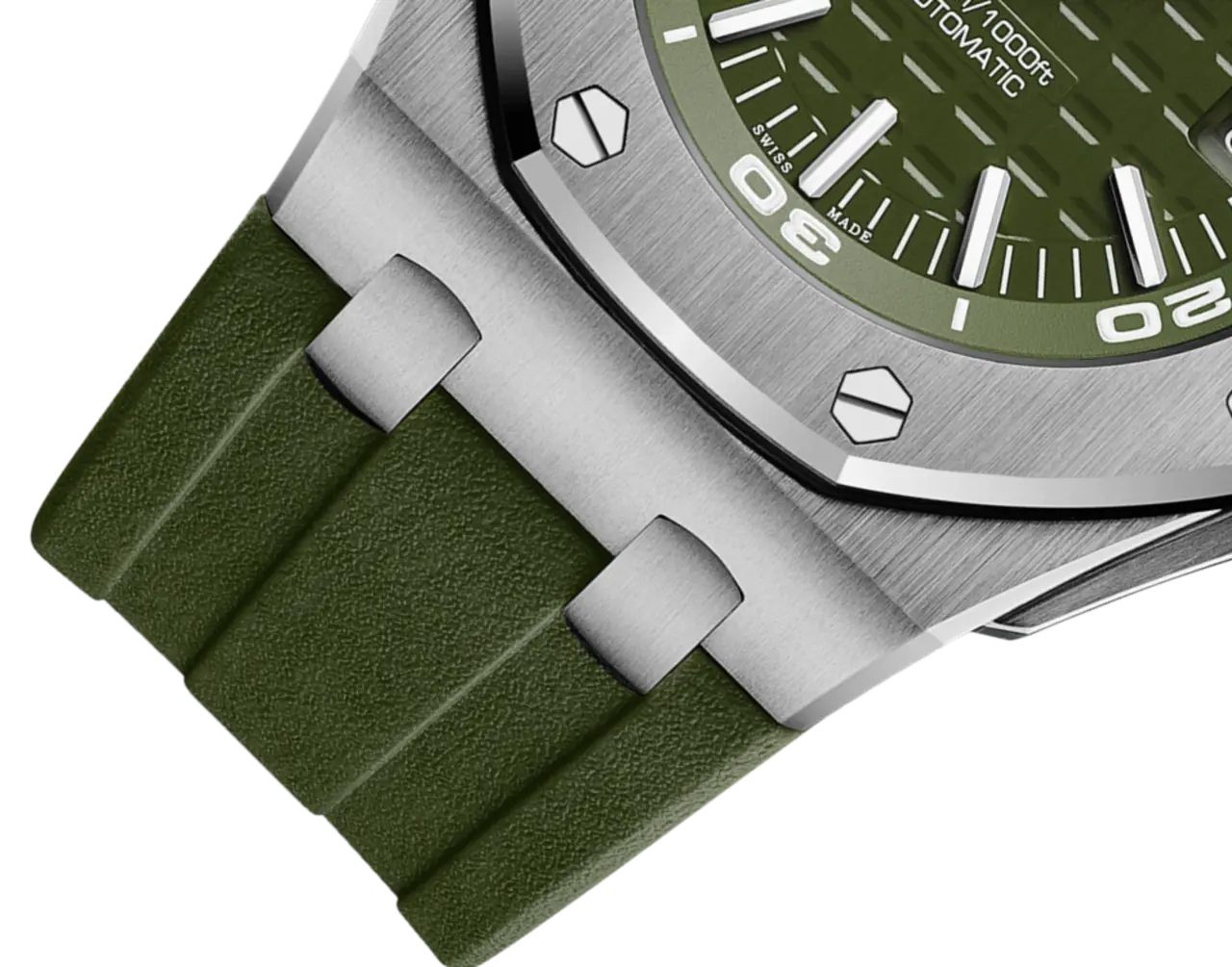 Khaki dial with “Méga Tapisserie” pattern, white gold applied hour-markers and Royal Oak hands with luminescent coating, khaki rotating inner bezel with zone from 60 to 15 minutes in white.