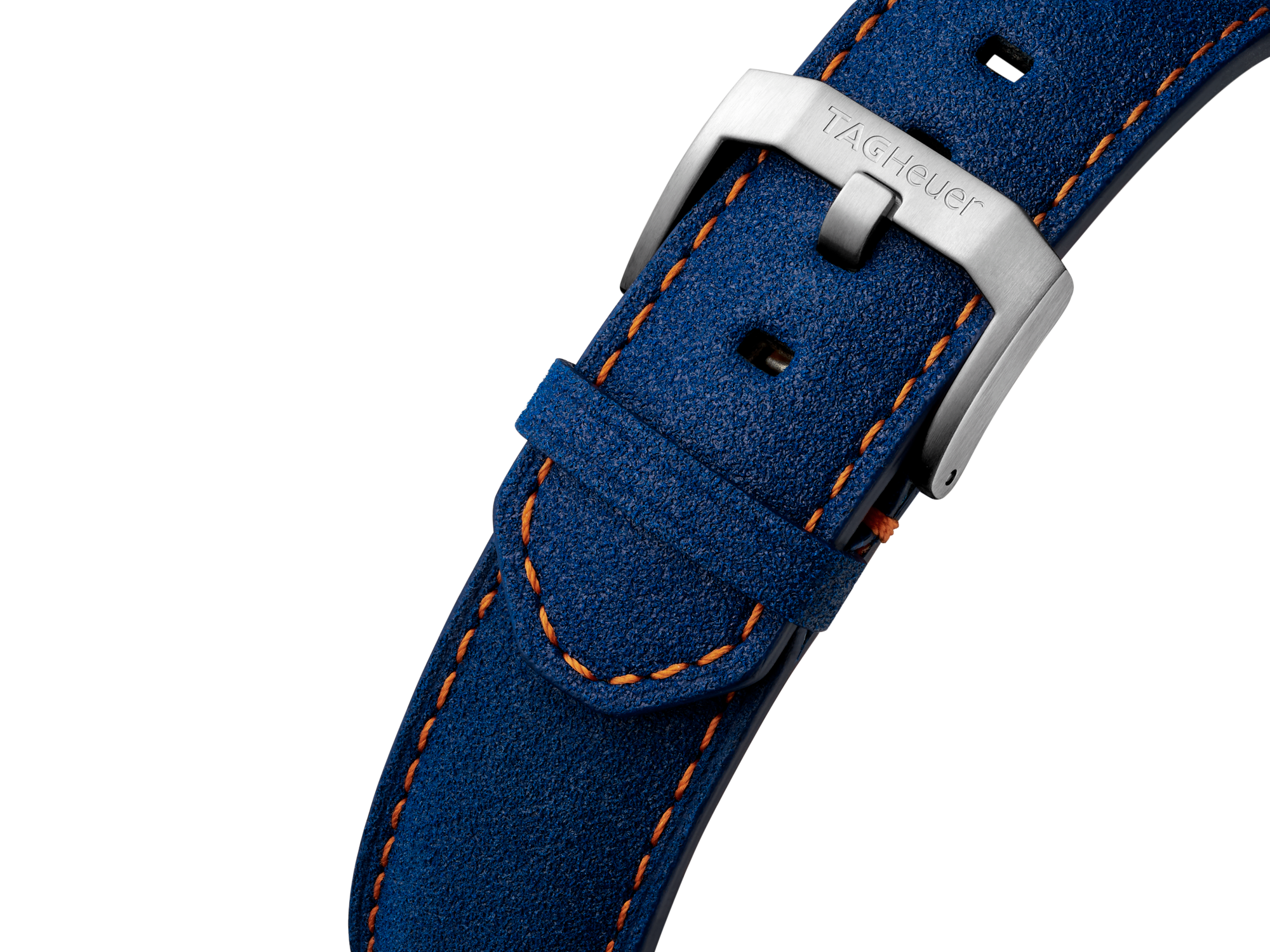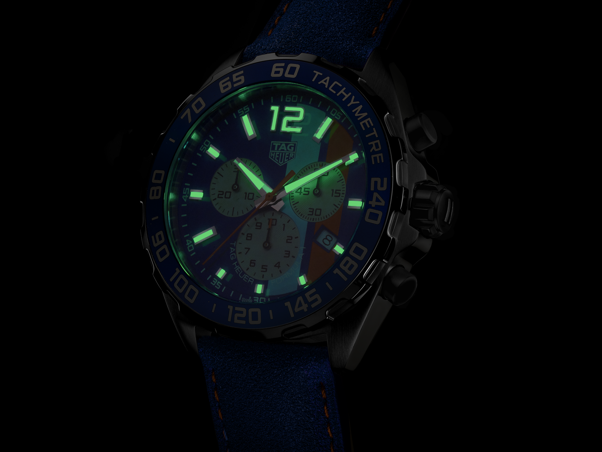 The TAG Heuer Gulf Formula 1 chronograph pays powerful tribute to two of motor racing’s greatest sponsoring legends. The brushed Gulf shield-blue dial sports the brand’s orange and blue stripes, as did Steve McQueen’s car in the 1971 film classic, Le Mans.