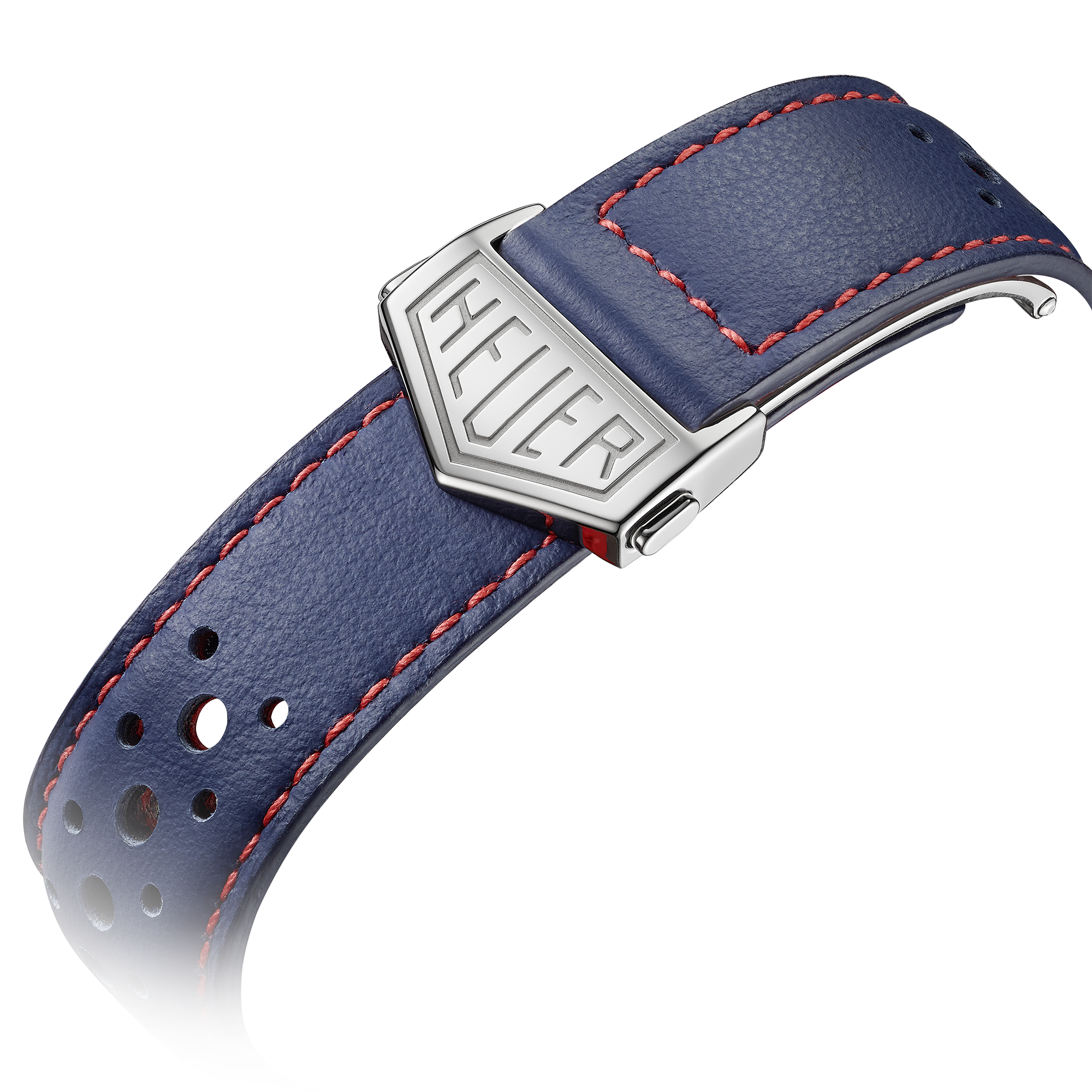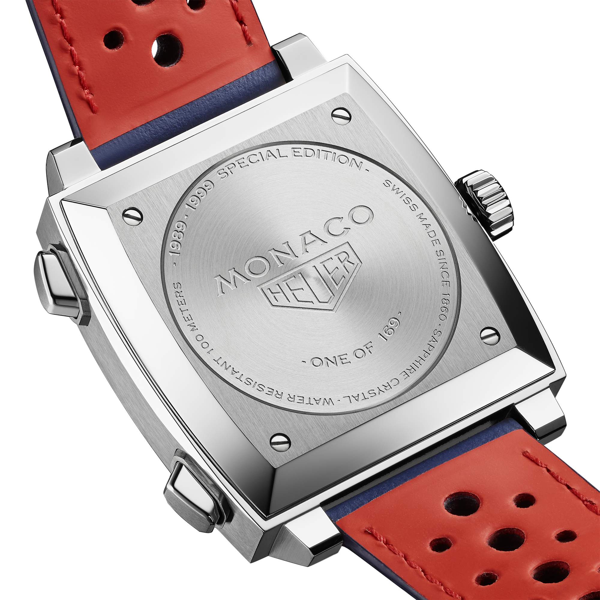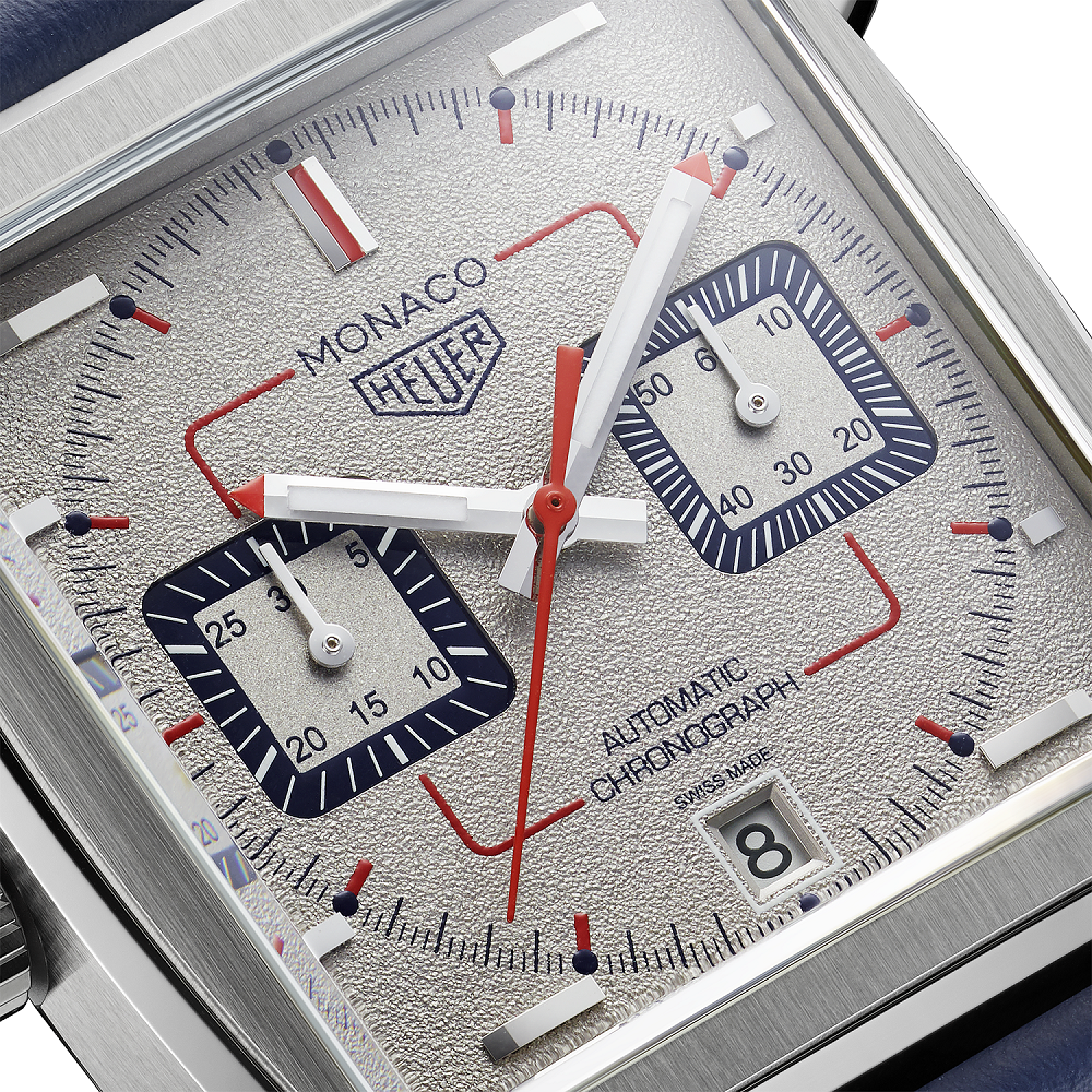 A 1990s-themed celebration edition of the ground-breaking Monaco, the iconic square-cased chronograph that changed the shape of watchmaking forever. Red touches jumpstart the look. Vintage shades of Heuer blue and a gray-grained dial give it true motor-sporting appeal.